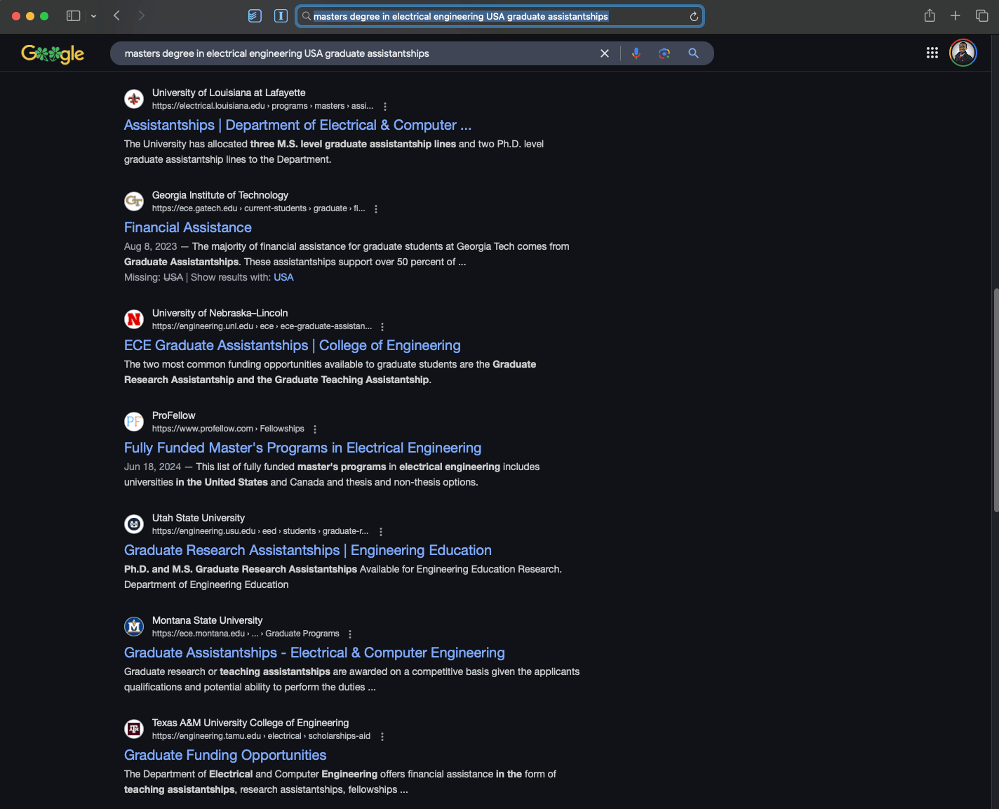 For example, "masters degree in electrical engineering USA graduate assistantships”.