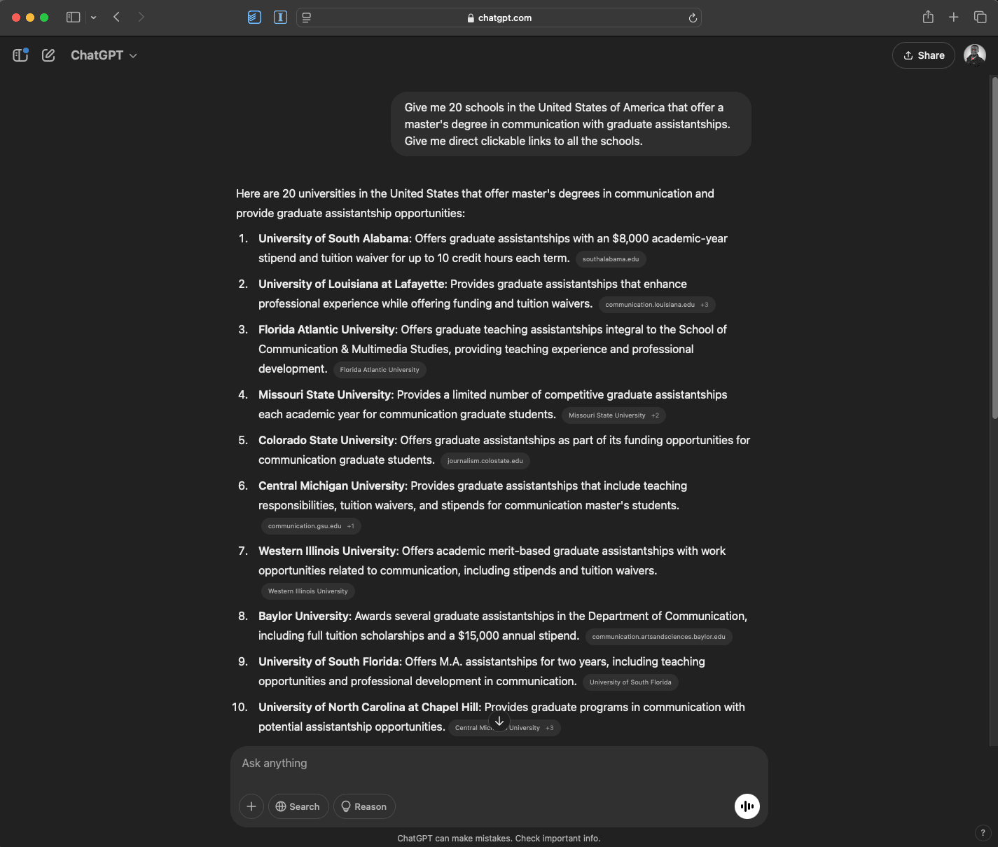 Give me 20 schools in the United States of America that offer a master's degree in communication with graduate assistantships. Give me direct clickable links to all the schools.