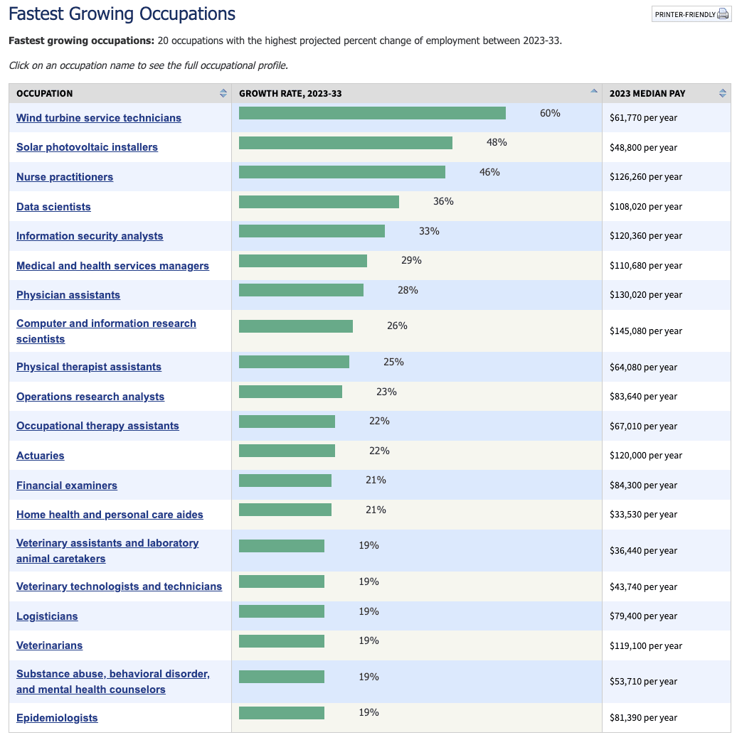 The U.S. Government published a list of 20 occupations with the highest growth rate between 2023 and 2033.